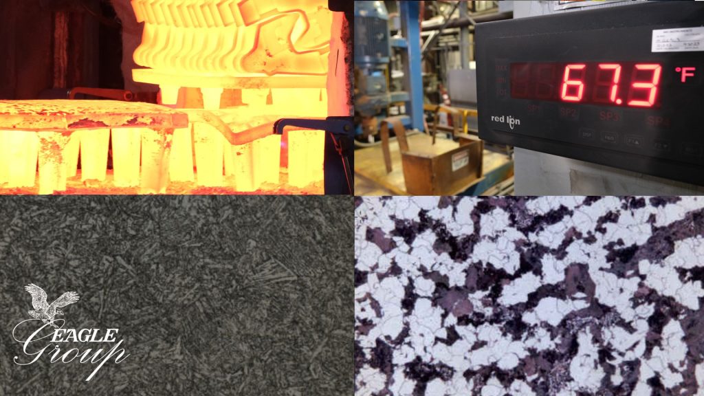 Metalcasting is a highly specialized and customizable form of metalworking. Foundries like Eagle Alloy and Eagle Precision cast hundreds of ferrous and nonferrous alloys. But manufacturers are more concerned with grades than alloys. Grading systems, like those developed by ASTM and SAE, take chemistry, heat treatment and properties into consideration. Often, the differences between two distinct grades comes down to how they have been heat treated. Different grades require specific targets for mechanical properties, and only heat treatment can produce the desired outcomes. A successful product is one that meets a customer’s specifications in terms of both shape and material properties. This is achieved by following a carefully planned sequence of casting, heat treatment and, sometimes, machining.